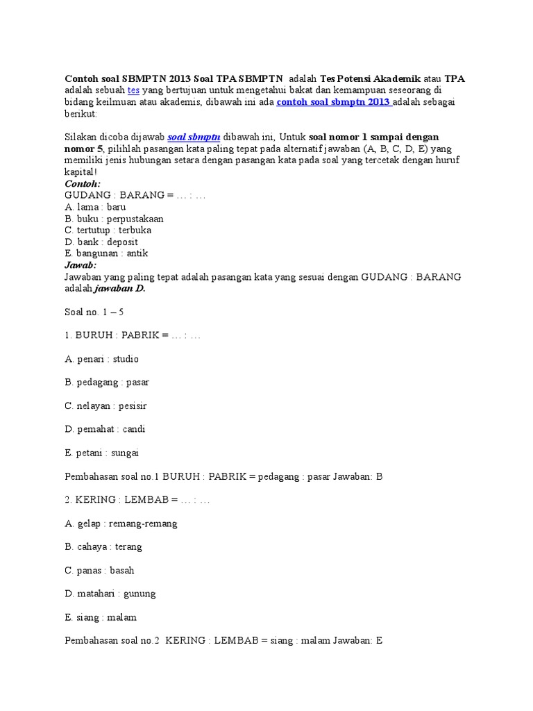 Contoh soal tes verbal potensi akademik dan kunci jawaban pada kesempatan kali ini saya akan memberikan kumpulan contoh soal lengkap untuk tes potensi akademik tpa dengan tema soal tes verbal yang berjumlah 114 soal yang lengkap dengan kunci jawabannya. sehingga sobat dapat belajar dirumah tanpa kebingungan dengan jawaban yang masih belum di. Sbmptn soal tpa (tes potensi akademik) berisi kumpulan soal tpa / tps sbmptn & usm stan dari tahun-tahun lalu yang telah dilengkapi dengan video pembahasan soalnya untuk persiapan utbk sbmptn kamu. soal-soal yang tersedia dalam laman ini, bisa kamu download secara gratis. selain itu, kamu bisa melihat video pembahasan jawabannya dalam web laman ini.